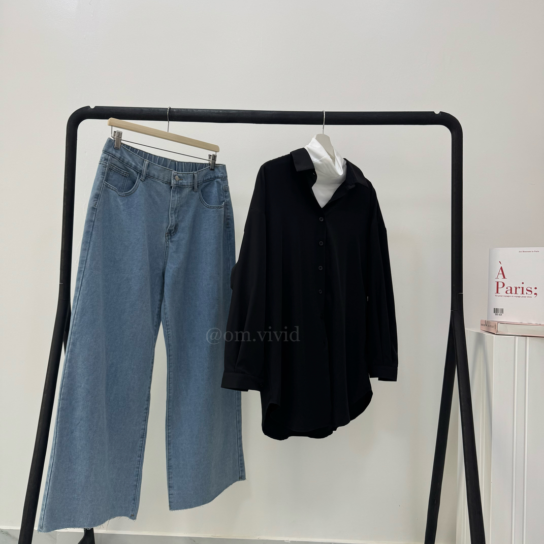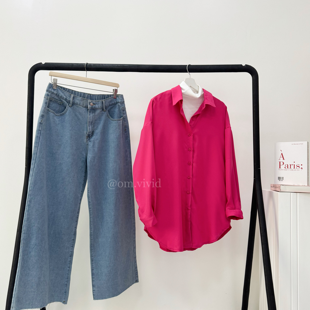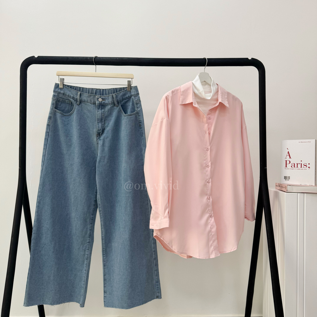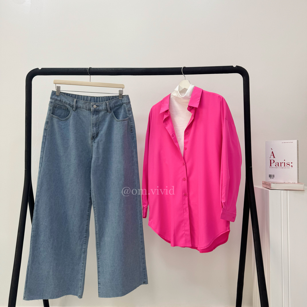 البنطلون: جينز واسع – يحتوي على ممر حزام – مطاط من الخلف