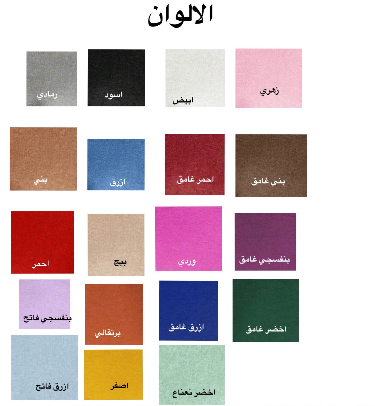 زهري, ابيض, اسود, رمادي, بني غامق, احمر غامق, ازرق, بني, بنفسجي غامق, وردي, بيج, احمر, اخضر غامق, ازرق غامق, برتقالي, بنفسجي فاتح, اخضر نعناع, اصفر, ازرق فاتح
