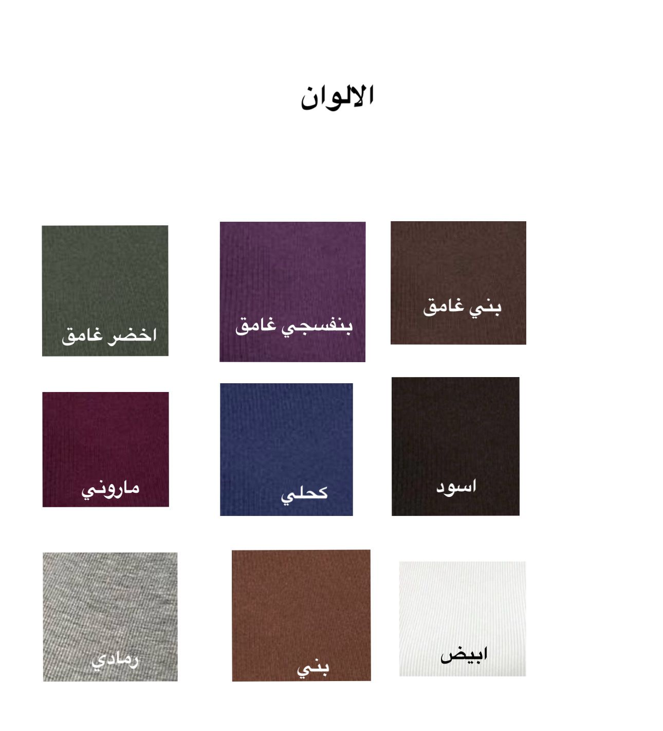 | اللون | بني غامق, بنفسجي غامق, اخضر غامق, اسود, كحلي, ماروني, ابيض, بني, رمادي |