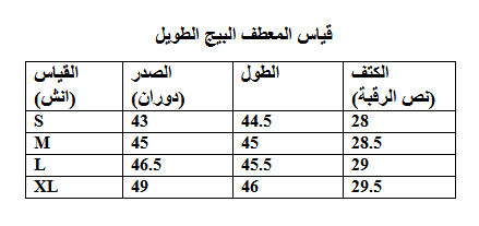 | قياس المعطف | S, M, L, XL |