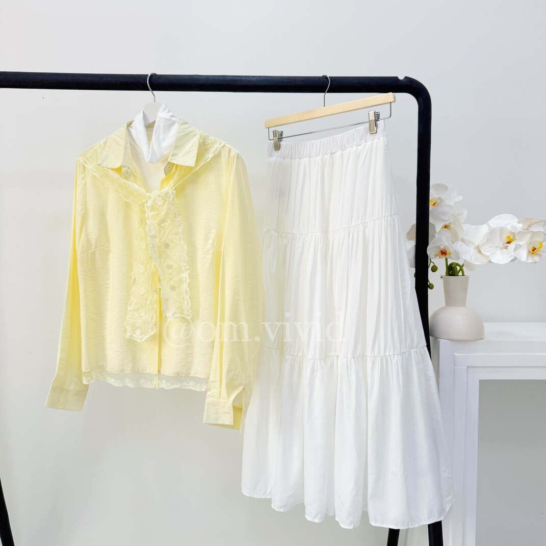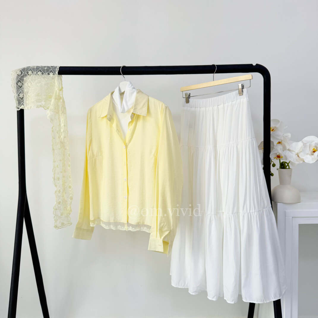 القميص: اصفر قطني بدانتيل مع وشاح بنسبة شفافيه بسيطه