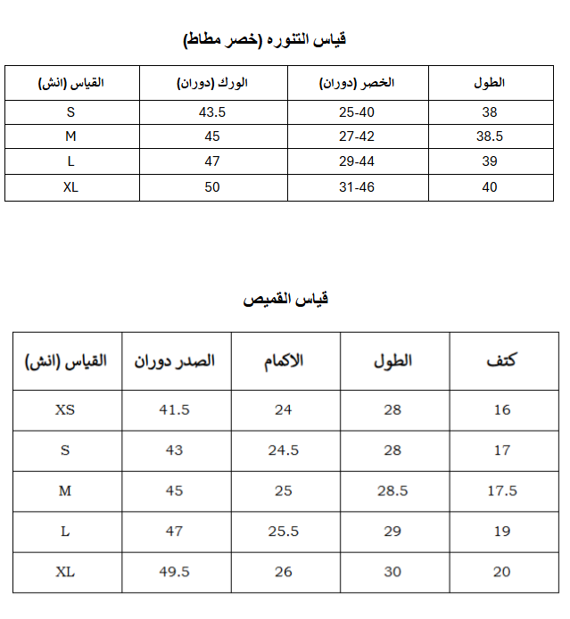 | قياس التنوره | S, M, L, XL |