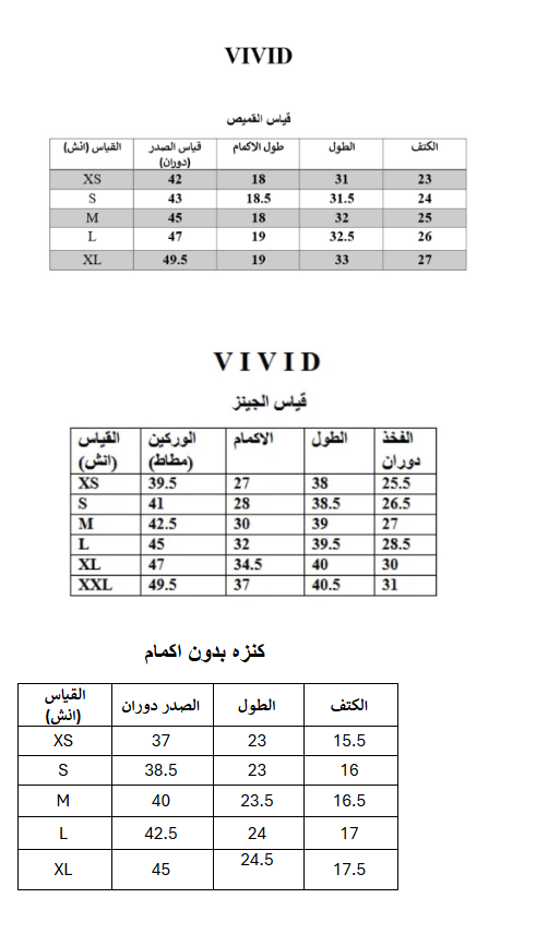 | قياس القميص الابيض | XS, S, M, L, XL |