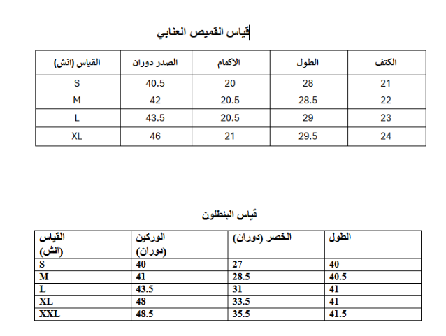 | قياس القميص | S, M, L, XL |