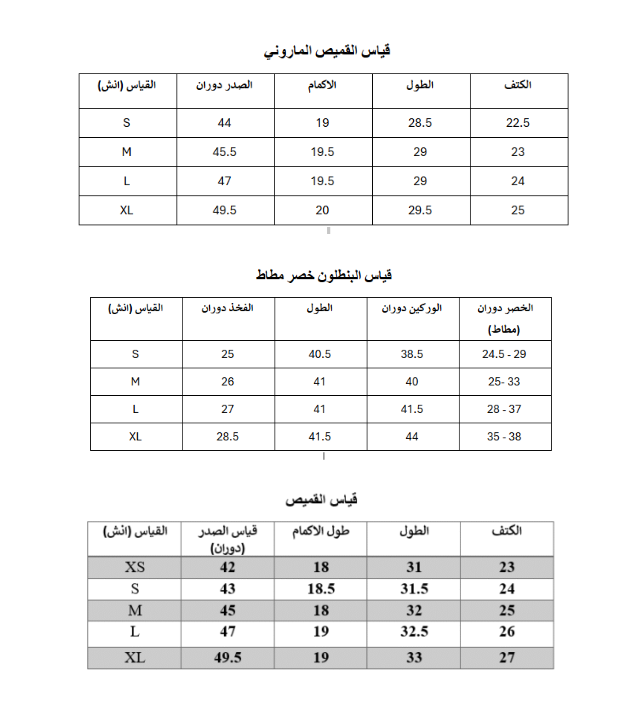 | قياس القميص و البنطلون الماروني | S, M, L, XL |