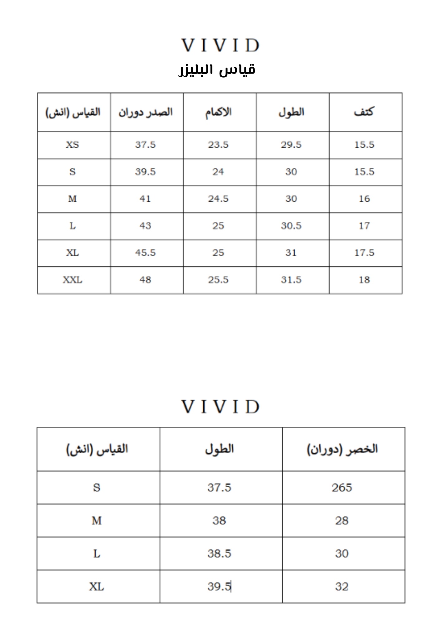 | قياس البليزر | XS, S, M, L, XL, XXL |