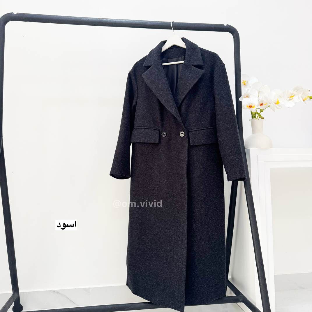 المعطف : صوفي ثقيل واسع و مبطن و بأزرار اماميه و فتحه سفليه من الخلف